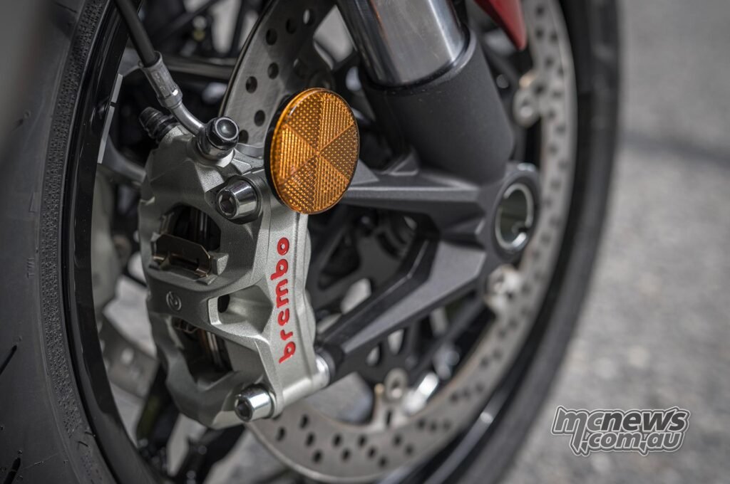 | Entrance Brakes | 2 x Ø 330 mm semi-floating discs, radially mounted Brembo Stylema monobloc 4-piston calipers, radial grasp cylinder PR16/19, Cornering ABS |