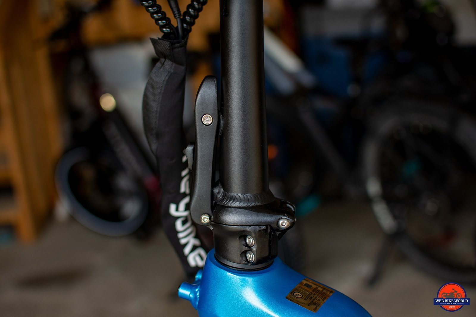 The folding handlebar stem is identical. It locks into place with a tactile and satisfying click on