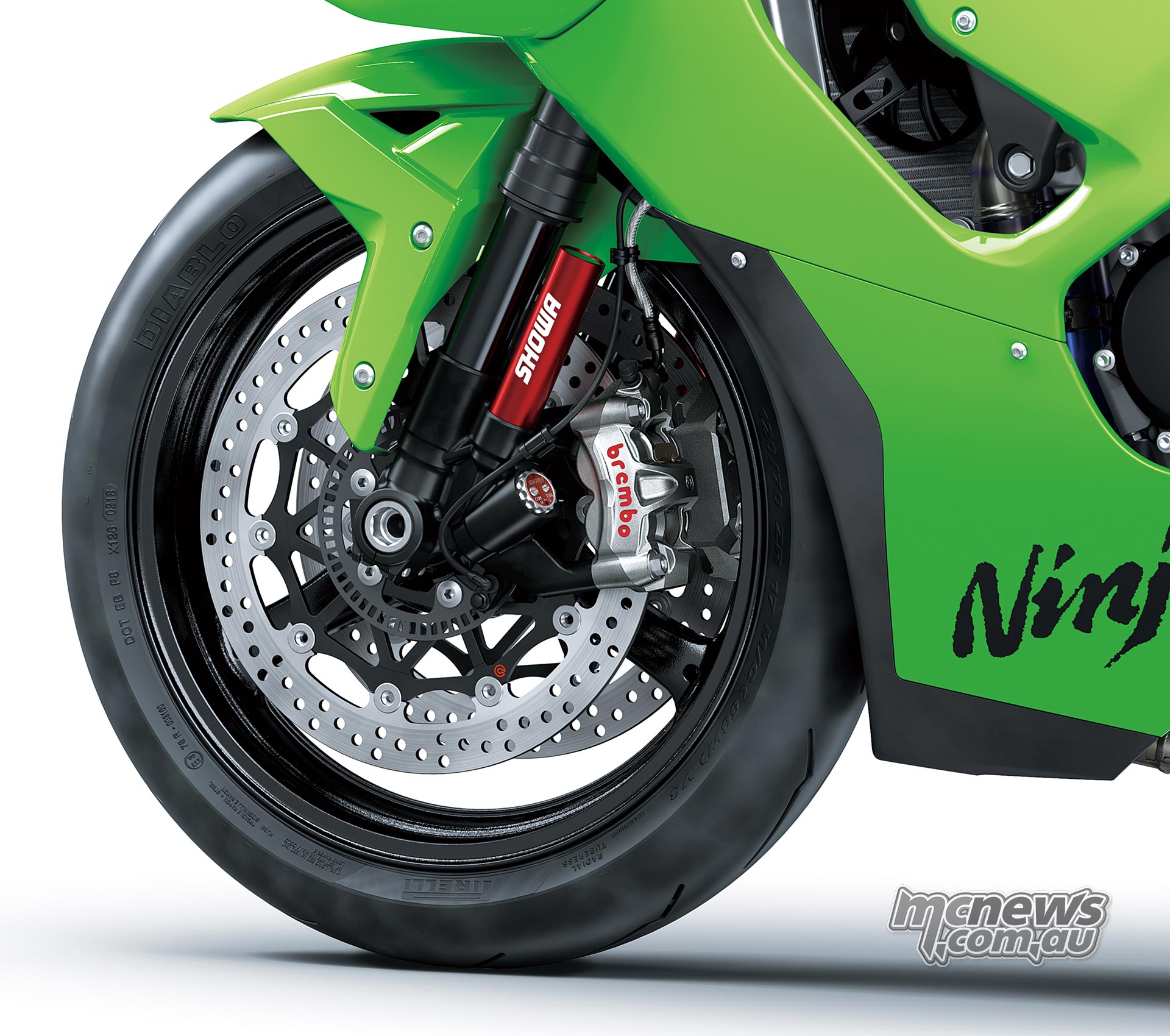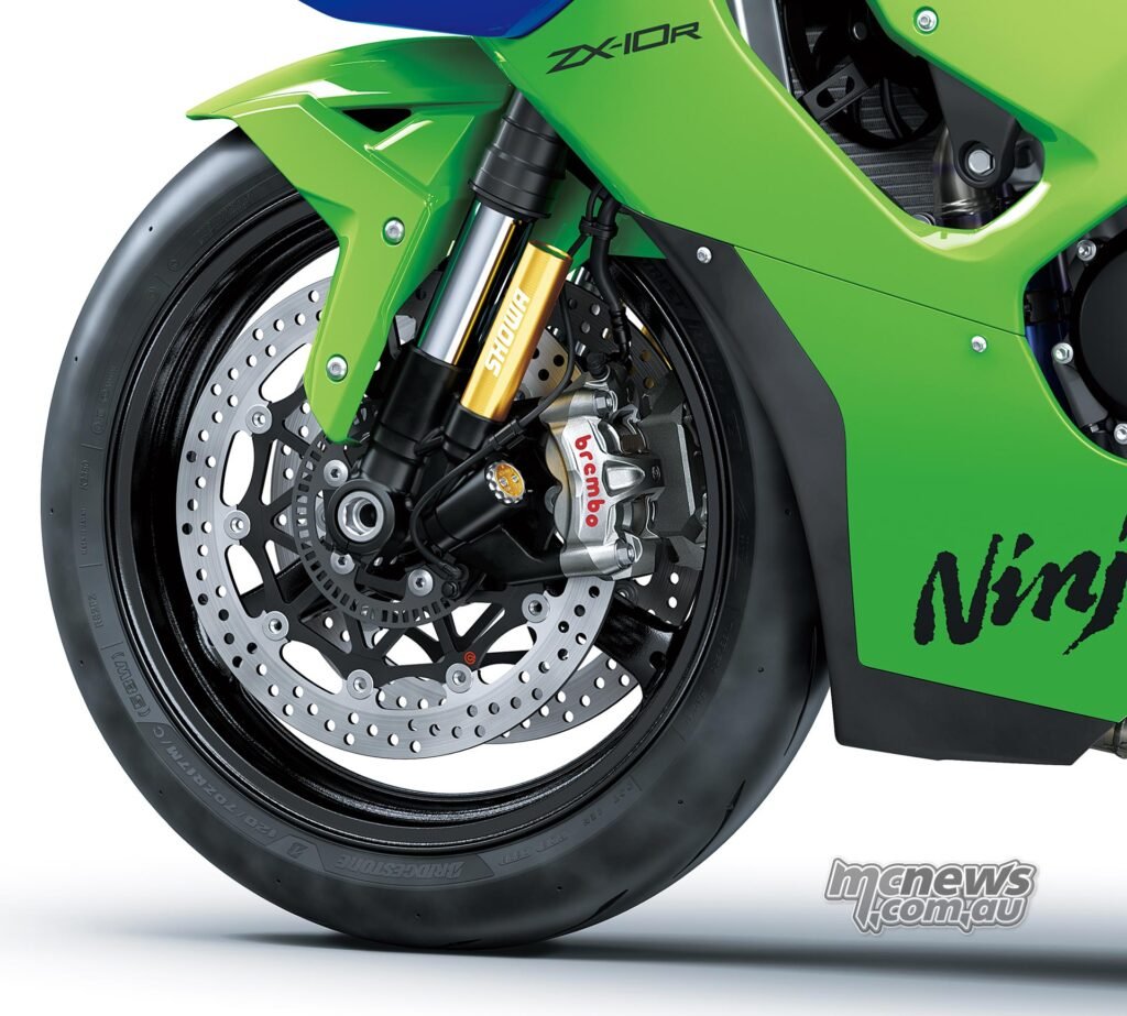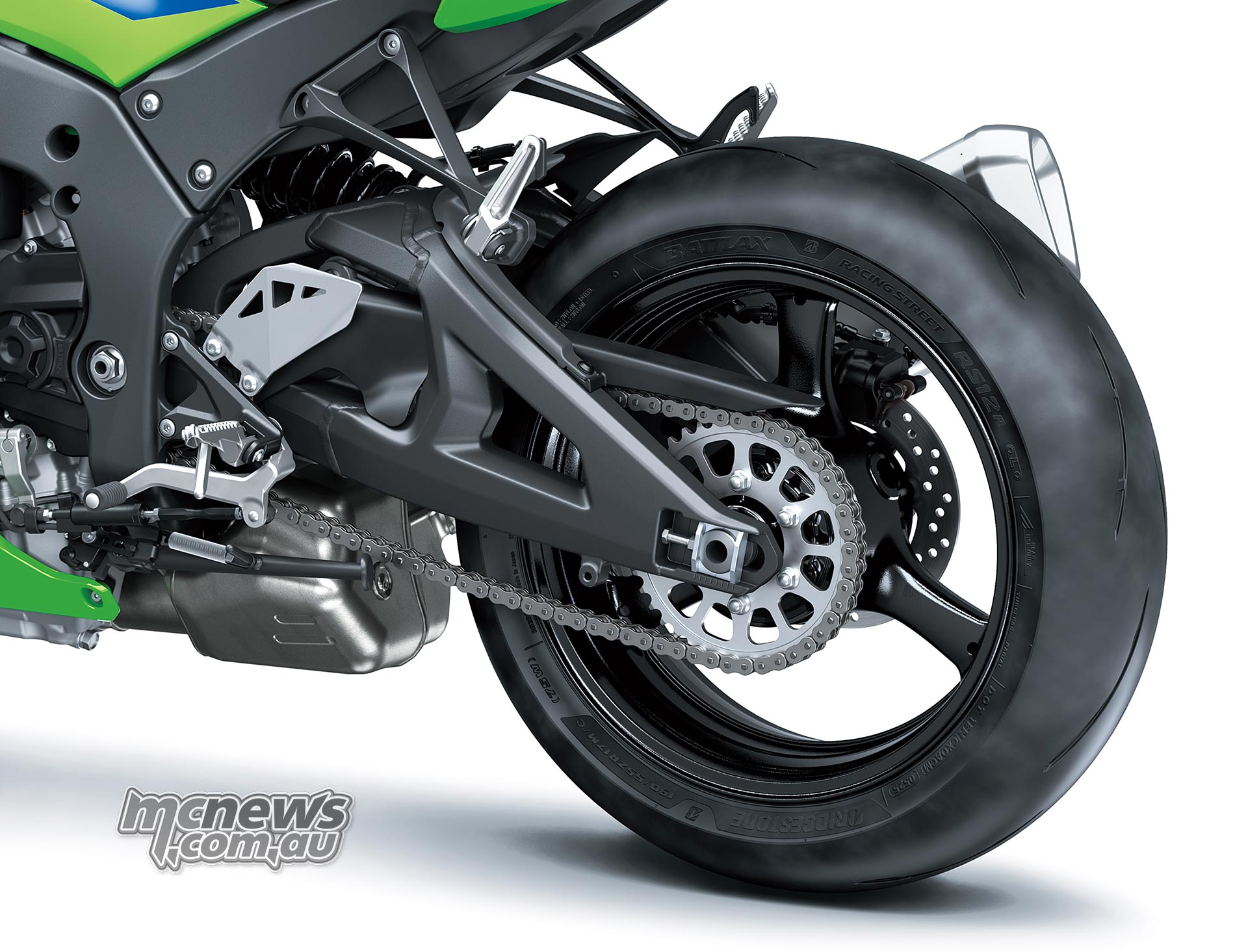Tyres are model-specific: the ZX-10R now makes use of Bridgestone Battlax Racing Avenue RS12, co-developed with Kawasaki, whereas the ZX-10RR is supplied with Pirelli Supercorsa SP V3 tyres impressed by WorldSBK competitors.
