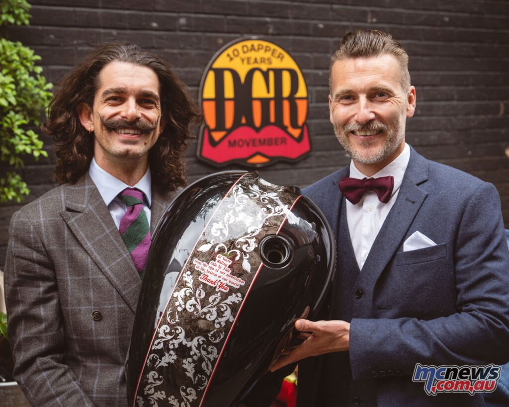 To mark the event, Director of International Improvements from Movember Dan Cooper offered Ramsey Sayed, from The Distinguished Gentleman’s Journey, with a bespoke, hand-painted Triumph tank on the London occasion.