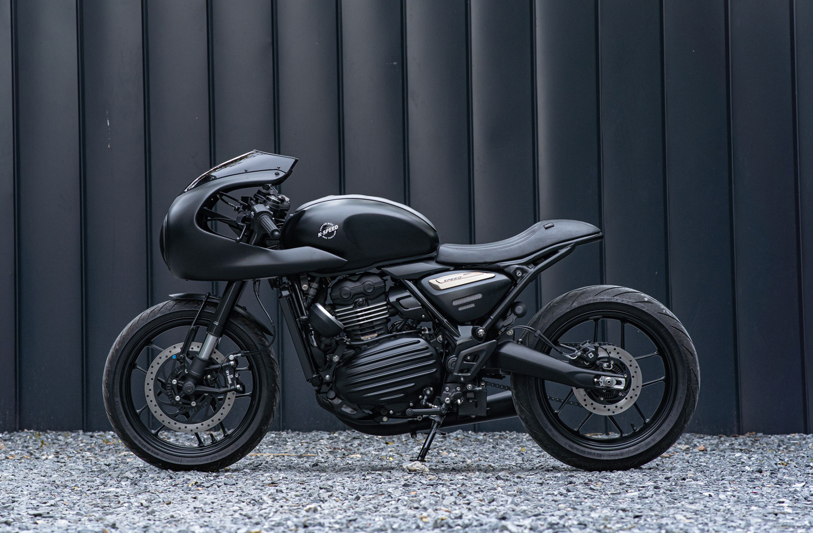 Further customized modifications to the Okay-Pace Triumph Pace 400 are the ‘wasps tail’ cafe racer solo seat designed particularly to enhance the modified subframe. Hailing from Okay-Pace’s personal Diablo vary of customized equipment is a smaller entrance fender supported by bespoke {hardware} and a customized exhaust system. Clip-on handlebars arrange an appropriately aggressive driving place and the speedometer has been relocated to the aspect of the body for a clutter-free cockpit. Carrying on the spartan theme, the bike’s aftermarket LED flip indicators and brake gentle have all been mounted inconspicuously. To coincide with this bike’s sinister colour scheme, the engine additionally wears black Okay-Pace covers that includes ribbed design particulars.