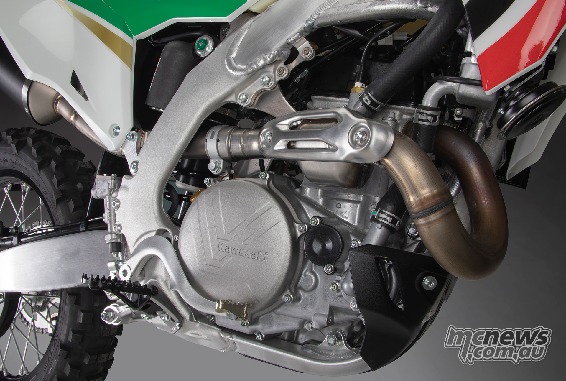 Chassis design centres round a tubular semi-double cradle body paired with a 49 mm upside-down telescopic fork and Uni-Trak rear suspension. Suspension journey is listed at 305 mm up entrance and 307 mm on the rear, underlining the mannequin’s competitors focus.