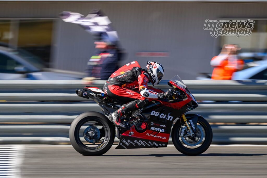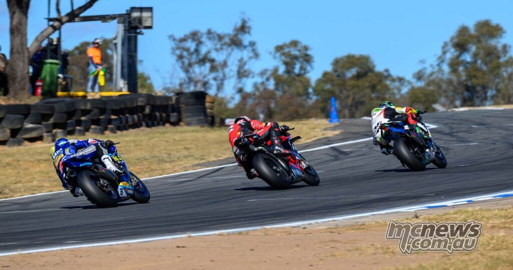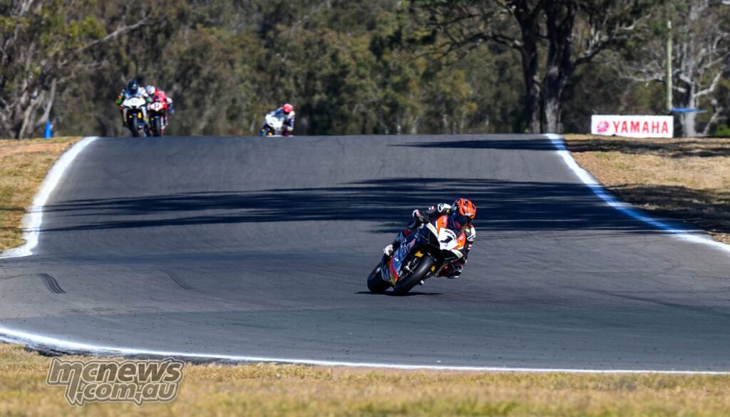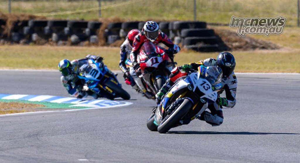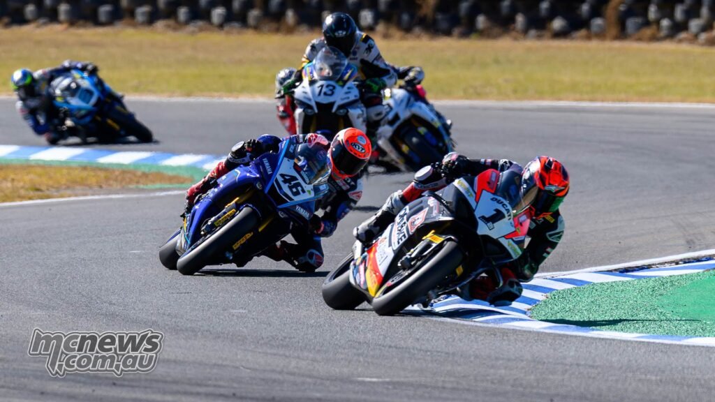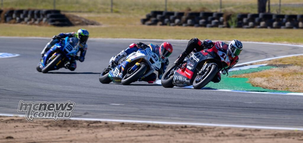 All riders bought away cleanly when the 16-lap SW-Motech Superbike race bought underway simply earlier than lunchtime on Sunday, however it was Josh Waters (McMartin Racing Ducati) who led Mike Jones (Yamaha Racing Crew) via the opening turns. Shut behind had been Anthony West, Jack Favelle, and Broc Pearson, whereas Jonathan Nahlous sadly went down at Flip 4 on the opening lap.