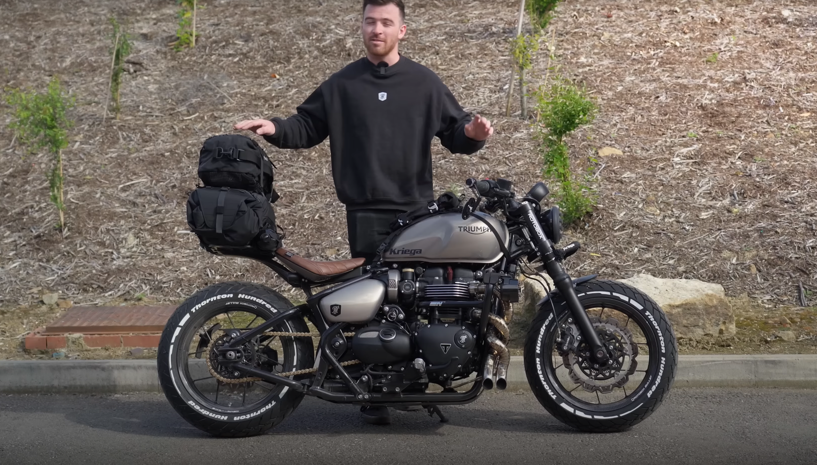 The bike is fitted with a full vary of Kriega luggage. There’s a tank-mounted bag for simple entry to small necessities like a passport, gloves, or helmet whereas touring. On the again of the bike, each a US-40 and US-20 bag are stacked, with the bigger bag carrying bulkier gadgets and the smaller bag on prime for extra clothing. An extra US-5 dry pack is connected on the entrance for issues that want to remain completely dry. All the baggage mount securely and maintain gear organized whereas touring.