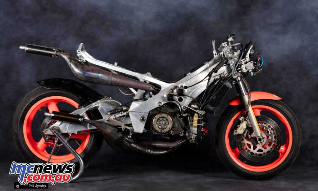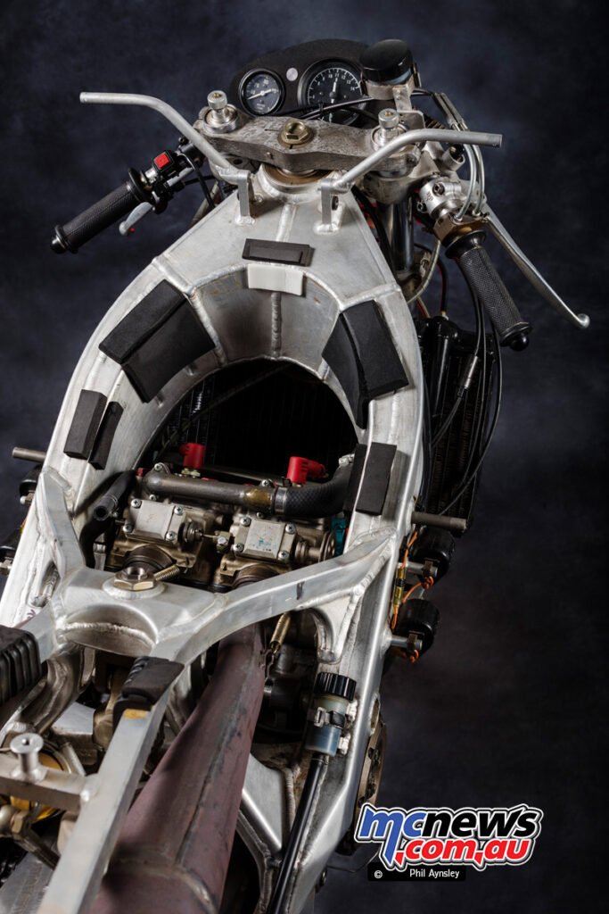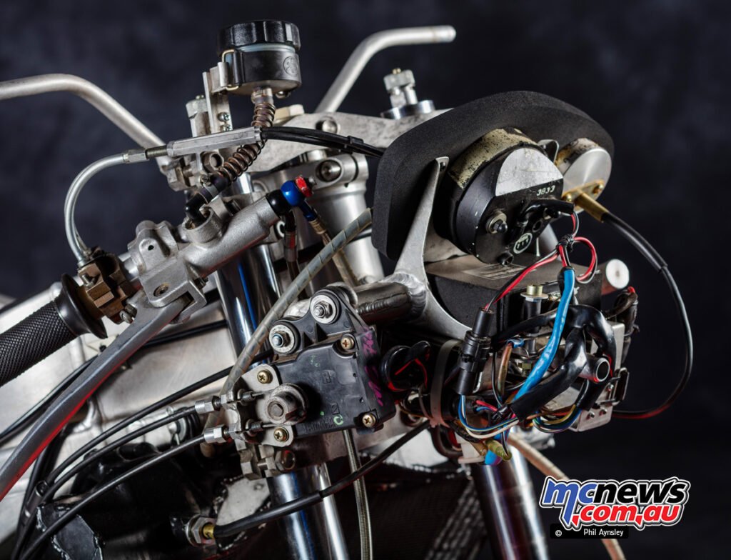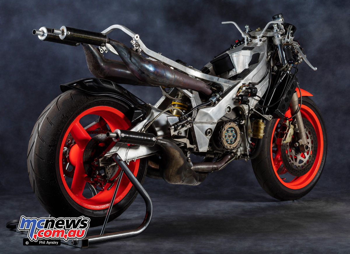 This was performed to cancel out the gyroscopic forces of the engine internals, bettering dealing with stability. The moist weight of the bike was 118 kg.