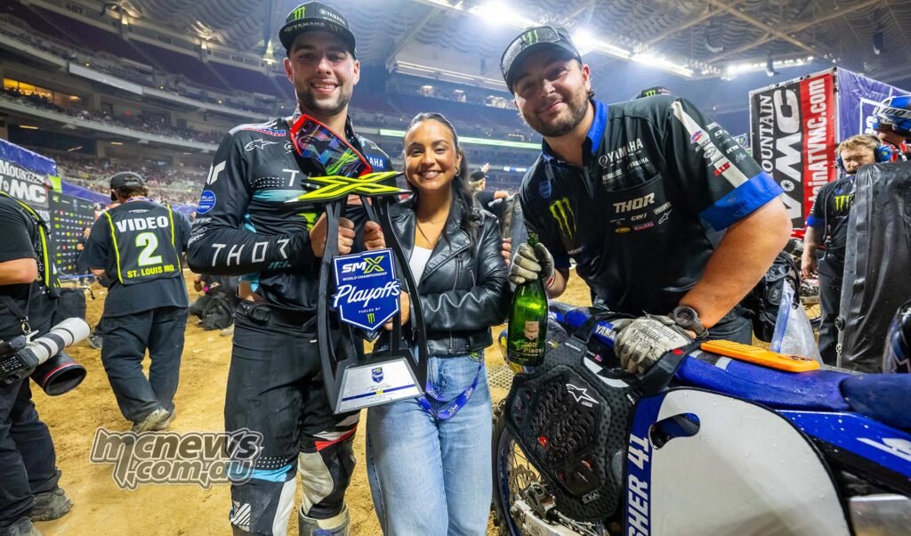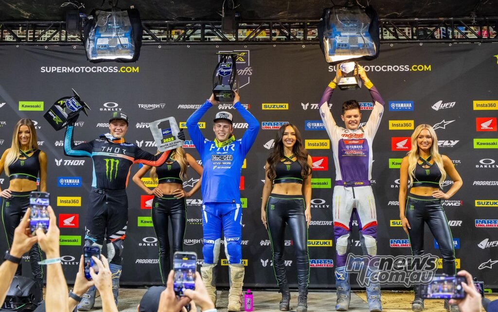 “Nice evening. [I’m] completely happy, although it’s bizarre, it’s like a coincidence, like we’re within the second spherical time and again. Nevertheless it’s good, you understand we’re attempting to construct a home so, fellas, if that bonus may hit Monday that might be fantastic. Somewhat cash all the time helps, so yeah we’d like some good issues they usually value cash [laughs]. So, huge because of the group, everybody that’s helped out, yeah, [I’m] stoked, what a very good evening.” – Hunter Lawrence, joking round on the rostrum when it was identified that he additionally gained Playoff 2 in 2024 with (1-3) moto scores.