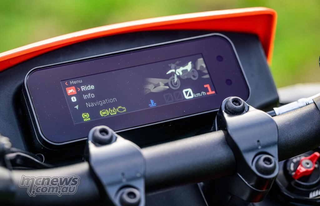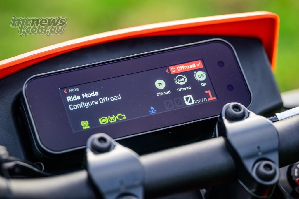 The traction management isn’t overly intrusive in slower, slipperier situations, which is the place you need it. Then you’ll be able to safely flick it off as soon as a bit extra predictable grip returns and convey the skids. Kudos to KTM for permitting the bike to recollect your settings while you key off, in order that while you do change TC off, it’s off while you key again on. Accurately.