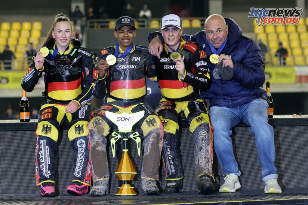 An elated German aspect tore up the historical past books, profitable their first world group titles at senior or junior degree, whereas the group’s No.3 Hannah Grunwald – the 2025 FIM Girls’s Speedway Gold Trophy winner – formally grew to become the game’s first-ever feminine world champion.