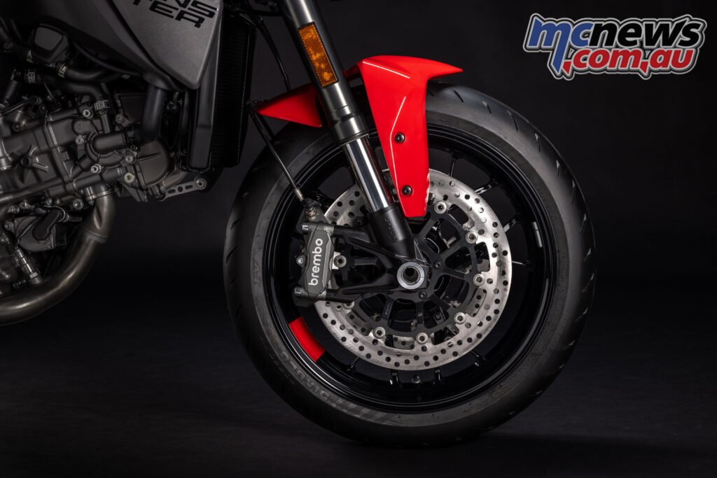 2 x Ø 320 mm semi-floating discs, radially mounted Brembo Monobloc M4.32 4-piston callipers, radial grasp cylinder. Cornering ABS.