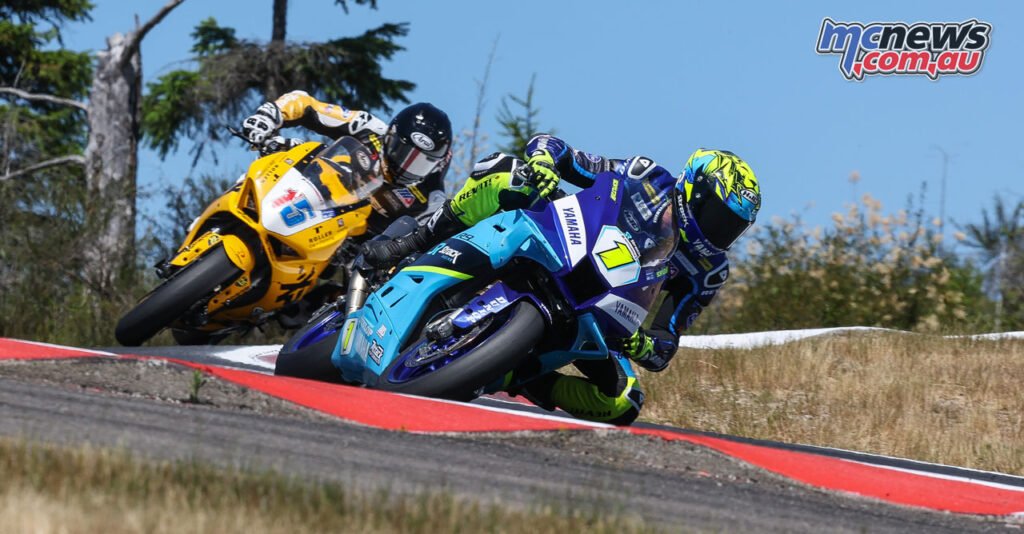 Mathew Scholtz (1) accomplished an ideal weekend in Motovation Supersport motion at Ridge Motorsports Park, with two wins over his championship rival PJ Jacobsen (15). Photograph by Brian J. Nelson
