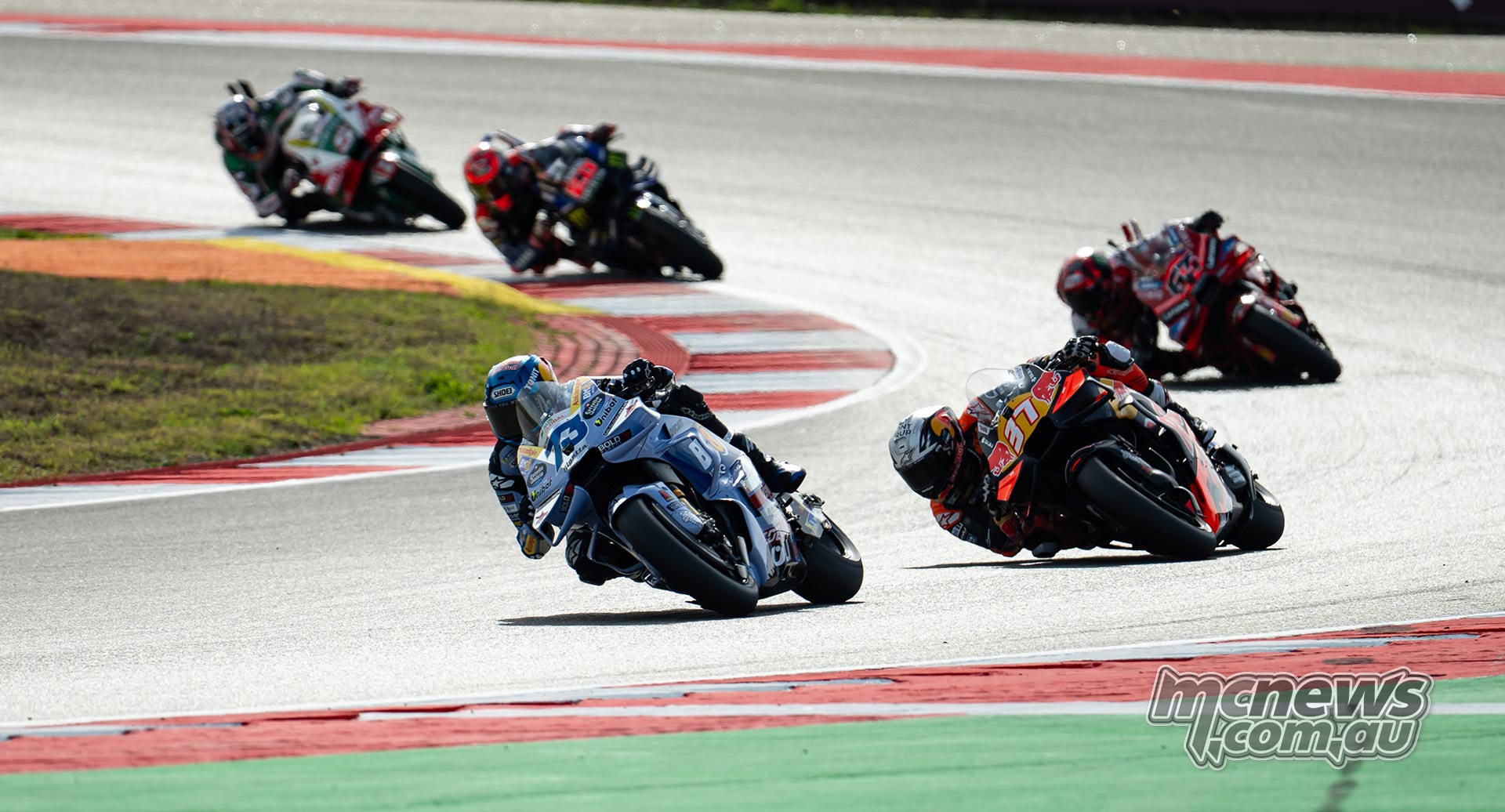 The highest three shortly broke away whereas drama unfolded additional again. Franco Morbidelli (Pertamina Enduro VR46 Racing) clashed with Enea Bastianini at flip 5 on the opening lap. Morbidelli ended up taking place whereas Bastianini needed to cease and release his bars from the fairing of his KTM earlier than he may get going once more.