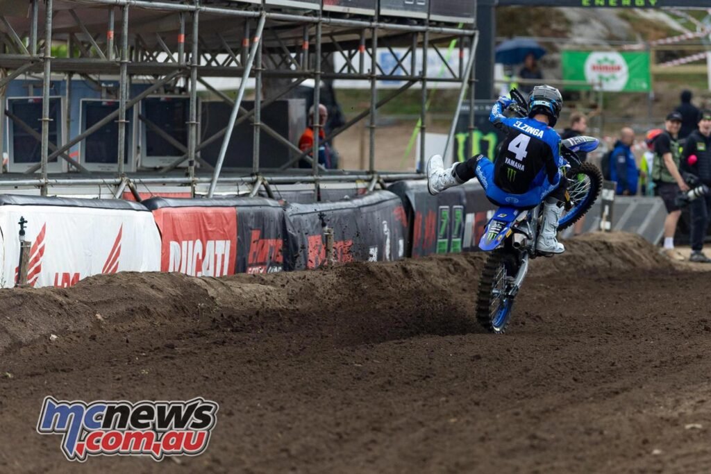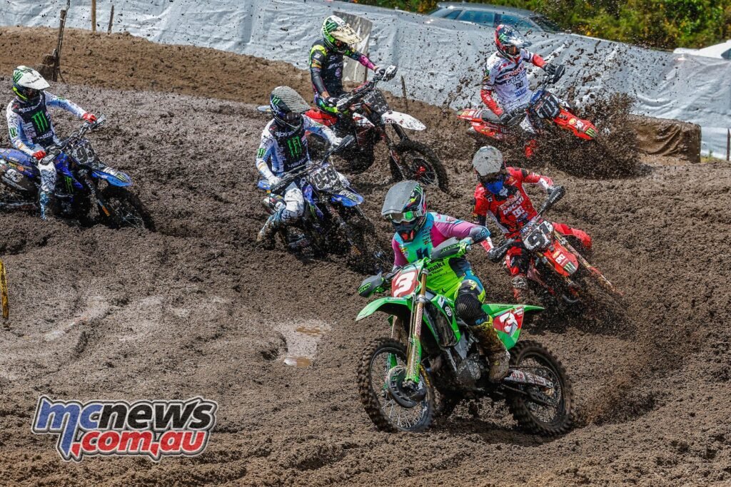 On a really moist circuit for MX2 race one, Qualifying Race winner Thibault Benistant shot to the entrance for Monster Vitality Yamaha Manufacturing facility MX2 to say his second Fox Holeshot Award of the season, whereas the Monster Vitality Triumph Racing machine of Camden McLellan veered across the outdoors of Laengenfelder within the third nook of the race to take second place.