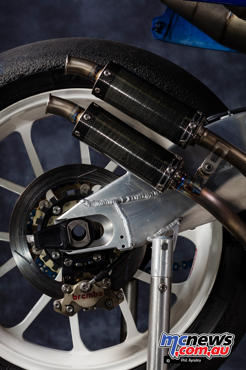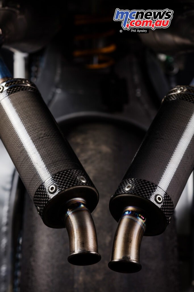 Engine efficiency was one other crucial space. The Suzuki V4 was identified to undergo a pronounced mid-range deficit round 10,000 rpm in comparison with its Honda and Yamaha rivals, with estimates putting the shortfall at greater than 20 horsepower. To deal with this, newly designed enlargement chambers have been developed by Group Roberts’ US-based engine tuner Bud Aksland. Whereas they didn’t fully erase the hole, these pipes considerably improved mid-range response and rideability.