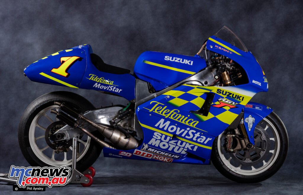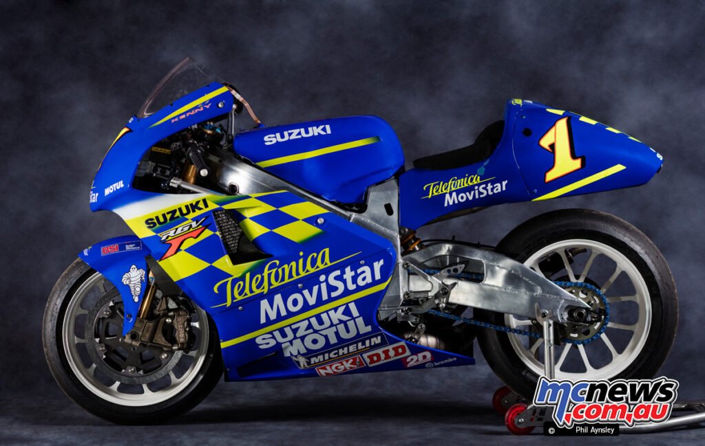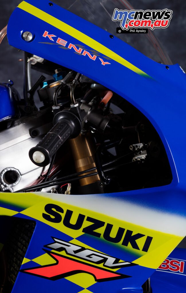 That is Kenny Roberts Jr.’s Suzuki RGV XR80, the machine on which he secured the 2000 500 cc World Championship, and it represents some of the methodical growth successes of the ultimate two-stroke period.