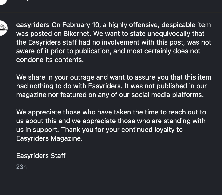 “On February 10, a extremely offensive, despicable merchandise was posted on Bikernet,” the apology begins. “We need to state unequivocally that the Easyriders employees had no involvement with this submit, was not conscious of it previous to publication, and most actually doesn’t condone its contents. We share in your outrage and need to guarantee you that this merchandise had nothing to do with Easyriders. It was not revealed in our journal nor featured on any of our social media platforms. We respect those that have taken the time to succeed in out to us about this and we respect those that are standing with us in help. Thanks on your continued loyalty to Easyriders Journal.”